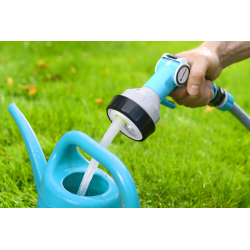A high-class, ergonomic, four function hand sprinkler with a graduated water flow regulation