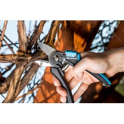 Sécateur à enclume ergonomique et réglable, qui permet d'ajuster l'ouverture au diamètre de la branche et à la main de l'utilisateur