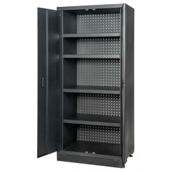 Côtés perforés en partie basse Système de fermeture centralisé par serrure Pieds ajustables 4 étagères amovibles