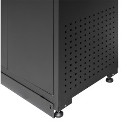Côtés perforés en partie basse Système de fermeture centralisé par serrure Pieds ajustables 2 étagères sur glissières 1 étagère réglable 2 tiroirs sur glissière