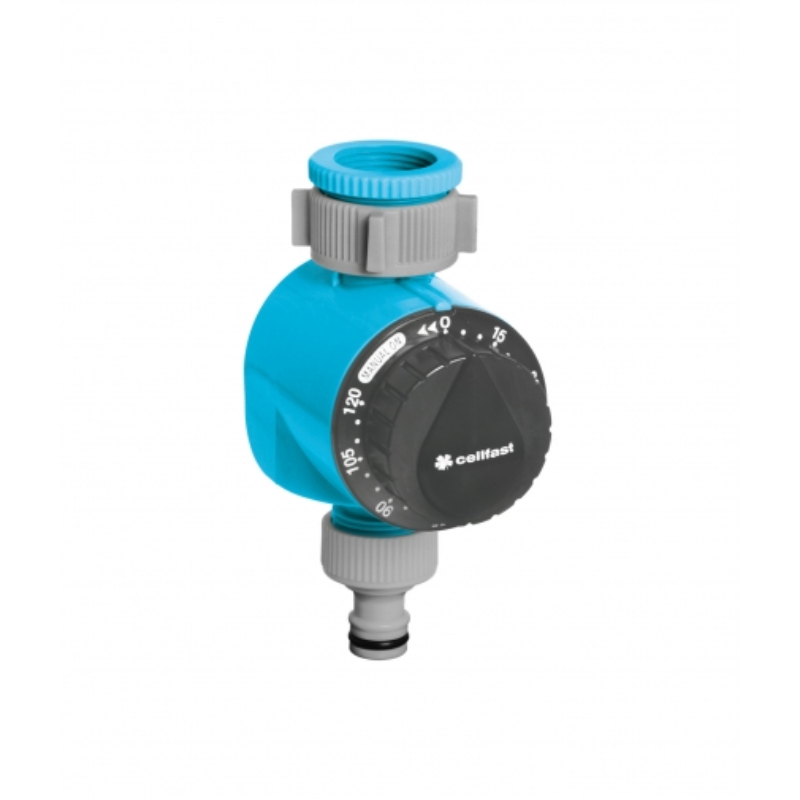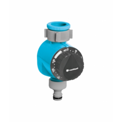 Horloge avec interrupteur automatique Construction en plastique de haute qualité Durée d'irrigation réglée manuellement jusqu'à 120 minutes Fonctionne sans piles Raccord robinet 3/4'' et 1'' Pression de service max : 6 bar